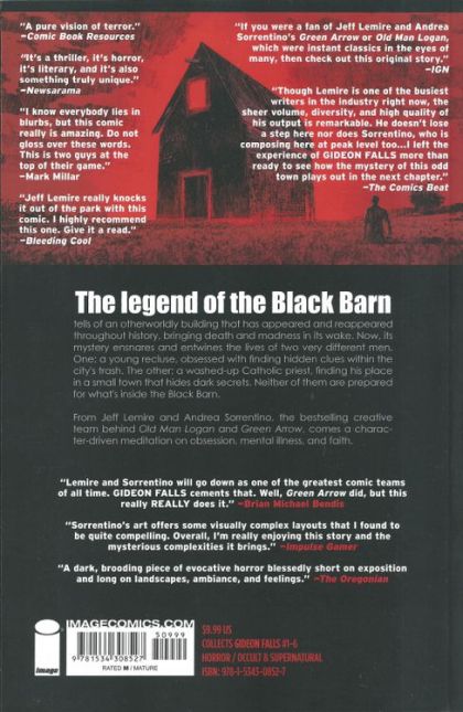 Picked up for TV by Hivemind after a multi-studio bidding war with long-time producing partners Sean Daniel and Jason Brown, Bad Robot veteran Kathy Lingg, and former Valiant Entertainment CEO & Chief Creative Officer Dinesh Shamdasani. From the bestselling creative team behind Old Man Logan and Green Arrow comes a character-driven meditation on obsession, mental illness, and faith. The legend of the Black Barn-an otherworldly building alleged to have appeared and reappeared throughout history, bringing death and madness in its wake-ensnares and entwines the lives of two very different men. Plus, this collection includes a variant cover gallery from some of comics' best artists, including CLIFF CHIANG (PAPER GIRLS), JOCK (WYTCHES), SKOTTIE YOUNG (I HATE FAIRYLAND), and more! Collects GIDEON FALLS #1-6