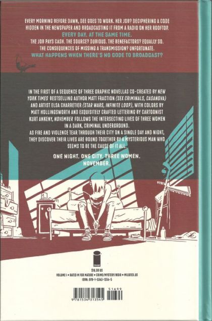 One phone call for help and all hell breaks loose for three strangers connected by bad luck, a twist of fate, and a gun in a puddle of rain. In the middle of a dense criminal underworld, these strangers' lives collide on one fateful and bloody night in this epic novelistic thriller by MATT FRACTION and ELSA CHARRETIER, with colors by MATT HOLLINGSWORTH and stunning hand-crafted lettering by cartoonist KURT ANKENY. One night. One city. Three women. NOVEMBER.