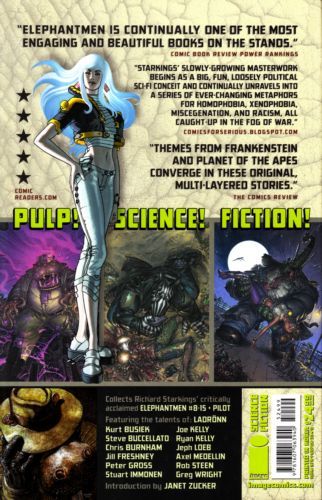 story RICHARD STARKINGS, JEPH LOEB, KURT BUSIEK & JOE KELLY art MORITAT, CHRIS BURNHAM, IAN CHURCHILL, STUART IMMONEN, PETER GROSS, RYAN KELLY, PHIL YEH, ROB STEEN, STEVE BUCCELLATO, BOO COOK & LADR?NN cover BOO COOK A meteor falls in Santa Monica Bay, and the lives of Hip Flask, Ebony Hide, Obadiah Horn, Sahara and her father, Joshua Serengheti converge once again with far reaching consequences for all. Over ten issues worth of ELEPHANTMEN in one big package! Introduction by PIA (Y: The Last Man) GUERRA. Collects ELEPHANTMEN #8-15, plus the Pilot issue and loads of extras!