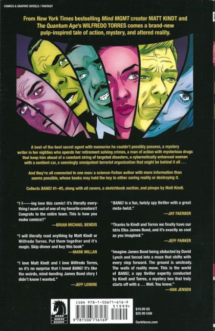 A best-of-the-best secret agent with memories he couldn't possibly possess, a mystery writer in her eighties who spends her retirement solving crimes, a man of action with mysterious drugs that keep him ahead of a constant string of targeted disasters, a seemingly omnipotent terrorist organization that might be behind it all . . . And they're all connected to one man: a science-fiction author with more information than seems possible, whose books may hold the key to either saving reality or destroying it. Collects BANG! #1-#5, along with all covers, a sketchbook section, and pinups by Matt Kindt.