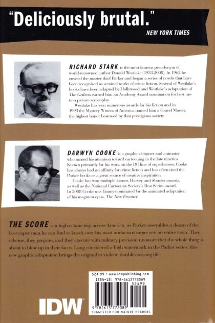 Fresh from his Eisner Award-winning efforts on The Hunter and The Outfit, Darwyn Cooke now sets his steely sights on The Score, the classic Richard Stark Parker novel from 1964. ?Parker becomes embroiled in a plot with a dozen partners in crime to pull off what might be the ultimate heist-robbing an entire town. Everything was going fine for a while, and then things got bad. Considered one of the best in the Parker series, The Score is the perfect vehicle for Darwyn Cooke to pull out all the stops and let loose with a book that has all the impact of a brutal kick to the solar plexus!