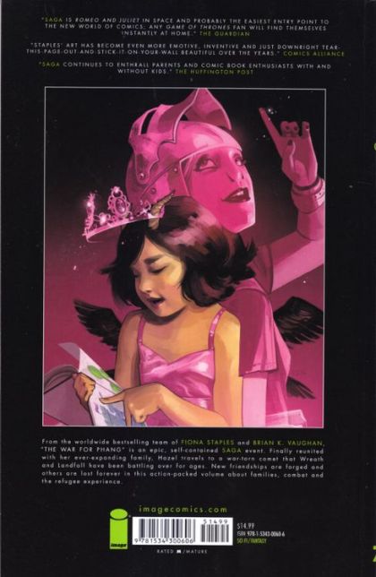 From the worldwide bestselling team of FIONA STAPLES and BRIAN K. VAUGHAN, "The War for Phang" is an epic, self-contained SAGA event! Finally reunited with her ever-expanding family, Hazel travels to a war-torn comet that Wreath and Landfall have been battling over for ages. New friendships are forged and others are lost forever in this action-packed volume about families, combat, and the refugee experience. Collects SAGA #37-42.