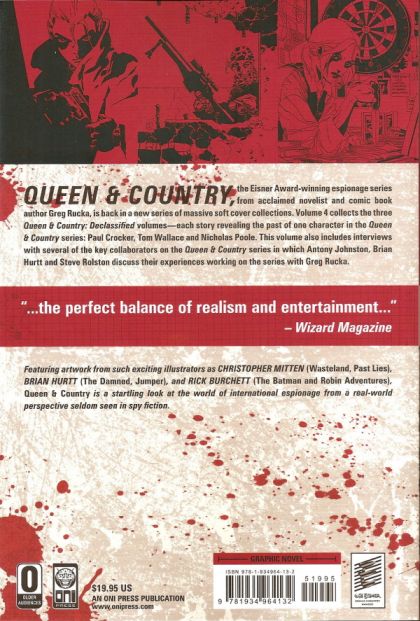 by Greg Rucka & Brian Hurtt The fourth Queen & Country Definitive Edition collects all three Declassified volumes under one cover! Get the background on Paul Crocker, Tom Wallace, and Nicky Poole as they sharpen their teeth as young agents of espionage! This volumes includes extras and interviews with many of the contributors to the Eisner-Award-winning series!