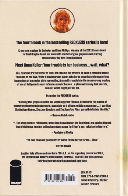 The fourth book in the bestselling RECKLESS series is here! Crime noir masters ED BRUBAKER & SEAN PHILLIPS present yet another original graphic novel starring troublemaker-for-hire Ethan Reckless. It's the winter of 1989 and Ethan is out of town, so this time, Anna has to tackle the job on her own. When a movie scream queen asks her to prove the mansion she's renovating isn't haunted, Anna will stumble into the decades-long mystery of one of Hollywood's most infamous murder houses... a place with many dark secrets - some of which might just kill her. Another hit from the award-winning creators of PULP, MY HEROES HAVE ALWAYS BEEN JUNKIES, CRIMINAL, and KILL OR BE KILLED - and a must-have for all ED BRUBAKER & SEAN PHILLIPS fans!