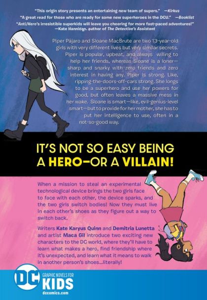 Piper Pájaro and Sloane MacBrute are two 13-year-old girls with very different lives but very similar secrets. Popular, outgoing Piper is strong-like, ripping-the-doors-off-cars strong. She longs to be a superhero, even if she tends to leave massive messes in her wake. Sloane, on the other hand, is snarky and super-smart. Like, evil-genius smart. To help her family, she has to put those smarts to use for her villainous grandfather. When a mission to steal an experimental technological device brings the two girls face to face with each other, the device sparks-and the two girls switch bodies! Now they must live in each other's shoes as they figure out a way to switch back. Anti/Hero is a story that explores what makes a hero, how one can find friendship where it's unexpected, and what it means to walk in another person's shoes...literally! Authors Kate Karyus Quinn (Another Little Piece, The Show Must Go On) and Demitria Lunetta (The Fade, Bad Blood) make their graphic novel debut alongside artist Maca Gil and introduce two new and exciting DC characters!