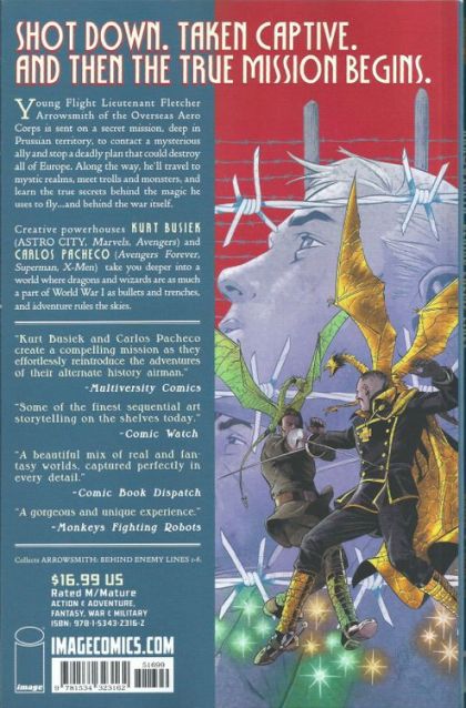 ADVANCE SOLICIT In a world where World War One is fought with magic and dragons as much as bullets and trenches, young Fletcher Arrowsmith of the Overseas Aero Corps is sent on a secret mission into enemy territory, to find a mysterious ally and stop a deadly plan that could destroy all of Europe. Along the way, he'll deal with dangerous enemy sorcerers, werewolves, and trolls...and learn the true secrets behind magic and the war itself. Superstar creators KURT BUSIEK (ASTRO CITY, Marvels) & CARLOS PACHECO (X-Men, Avengers Forever, Superman) deliver a war, and a world, like none other. Collects ARROWSMITH: BEHIND ENEMY LINES #1-6.