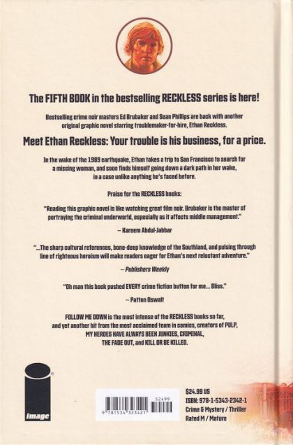The fifth book in the bestselling RECKLESS series is here! Crime noir masters ED BRUBAKER & SEAN PHILLIPS present yet another original graphic novel starring troublemaker-for-hire Ethan Reckless. In the wake of the 1989 earthquake, Ethan takes a trip to San Francisco to search for a missing woman. But almost immediately, he finds himself going down a path of darkness and murder in a case unlike anything he's faced before. FOLLOW ME DOWN is the most intense of the RECKLESS books so far and yet another hit from the most acclaimed team in comics, creators of PULP, MY HEROES HAVE ALWAYS BEEN JUNKIES, CRIMINAL, THE FADE OUT, and KILL OR BE KILLED. A must-have for all BRUBAKER & PHILLIPS fans!