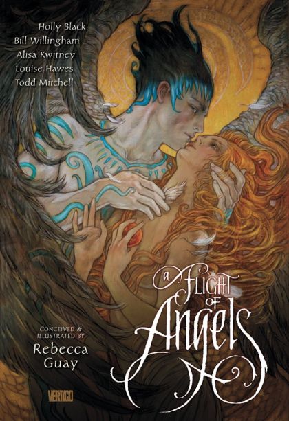 ANGELS: Guardians. Messengers. Warriors. Fallen. All these angelic aspects and more are explored in A FLIGHT OF ANGELS, a riveting tale in the tradition of The Decameron and The Canterbury Tales. A mysterious angel plummets to Earth and lands deep in a dark forest, where his dying body is found by the mystical denizens of this strange place. As the gathered fauns, fairies, hags and hobgoblins debate what to do with him, each tells a different story of who they imagine this celestial creature to be: a hero, a lover, a protector or a killer. Once the stories have been told, a verdict is rendered - and the outcome will leave you breathless. Conceived and stunningly illustrated by fantasy art legend Rebecca Guay (Magic: The Gathering, Veils), A FLIGHT OF ANGELS is written by an all-star lineup of today's top fantasy talent, including Bill Willingham (FABLES) and Holly Black (The Spiderwick Chronicles) in tales that will grip your heart and make your imagination soar.