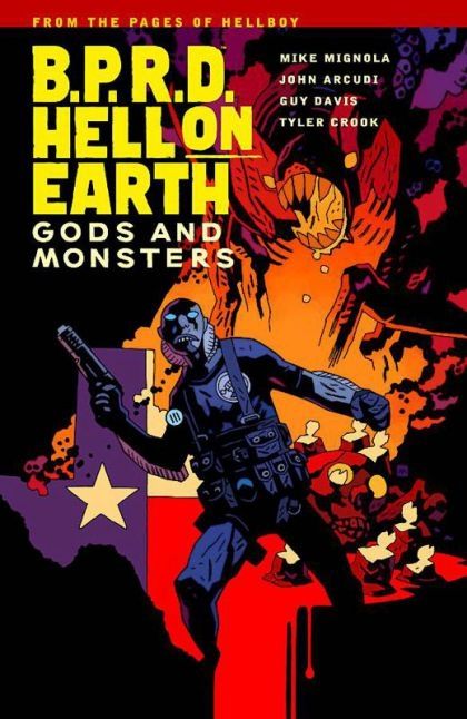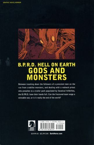 Mike Mignola (W/Cover), John Arcudi (W), Guy Davis (A), Tyler Crook (A), and Dave Stewart (C) Between tracking down the vagrant followers of a prescient teen pursued by crablike beasts and dealing with a redneck priest who preaches by way of human mutilation to a trailer park populated by a cult of hillbillies, the B.P.R.D. certainly have their hands full. Can a fractured team wage a winnable war or are they fighting a battle of attrition? B.P.R.D. Hell on Earth: Gods and Monsters continues the series Comics Alliance calls 'one of the best books on the stands.' Collects B.P.R.D. Hell on Earth: Gods #1-#3 and B.P.R.D. Hell on Earth: Monsters #1-#2.