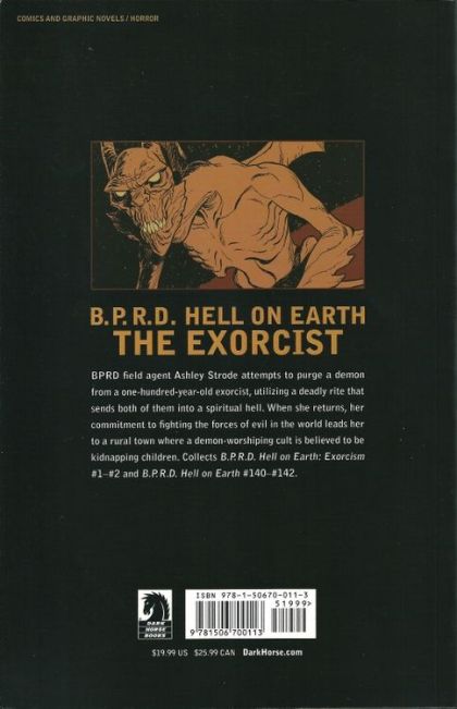 BPRD field agent Ashley Strode attempts to purge a demon from a hundred-year-old exorcist, utilizing a deadly rite that sends both of them into a spiritual hell. When she returns, her commitment to fighting the forces of evil in the world leads her to a rural town where a demon-worshiping cult is believed to be kidnapping children. Collects B.P.R.D. Hell on Earth: Exorcism #1-#2 and B.P.R.D. Hell on Earth #140-#142.
