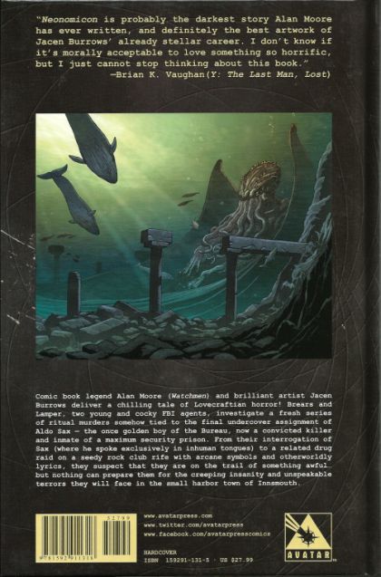 Cover: Jacen Burrows Writer: Alan Moore Art: Jacen Burrows Comic book legend Alan Moore (WATCHMEN) and brilliant artist Jacen Burrows deliver a chilling tale of Lovecraftian horror! Brears and Lamper, two young and cocky FBI agents, investigate a fresh series of ritual murders somehow tied to the final undercover assignment of Aldo Sax -the once golden boy of the Bureau, now a convicted killer and inmate of a maximum security prison. From their interrogation of Sax (where he spoke exclusively in inhuman tongues) to a related drug raid on a seedy rock club rife with arcane symbols and otherworldly lyrics, they suspect that they are on the trail of something awful? but nothing can prepare them for the creeping insanity and unspeakable terrors they will face in the small harbor town of Innsmouth. NEONOMICON collects Alan Moore's comic book series for the first time in its entirety - including his original graphic novel, THE COURTYARD, which chronicled Aldo Sax's tragic encounter with the (somewhat) mortal agents of the Old Ones! Available in softcover and hardcover formats, with illustrated covers by Jacen Burrows (CROSSED).