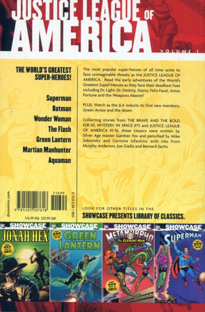 Written by Gardner Fox Art by Mike Sekowsky, Carmine Infantino, Murphy Anderson and Bernard Sachs Cover by Anderson The newest installment in the SHOWCASE PRESENTS collection spotlights the JLA! In these stories from THE BRAVE AND THE BOLD #28-30, JUSTICE LEAGUE OF AMERICA #1-16 and MYSTERY IN SPACE #75, thrill to confrontations with intergalactic, mystical, and super-powered rogues such as Despero, Kanjar Ro, Dr. Destiny, Amos Fortune and Felix Faust!
