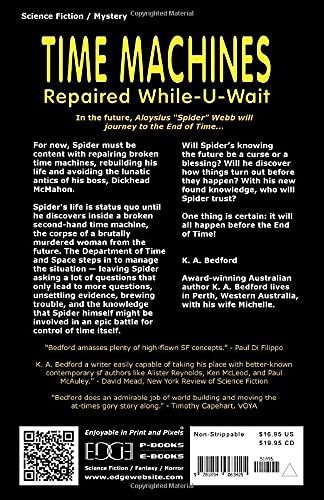 For "Time Machines Repaired While-U-Wait" specialist, Aloysius "Spider" Webb, time travel has lost its luster. Working as a senior time machine repair technician, Spider has seen it all - past, present and future. Wanting more out of life, Spider hates time travel and everything that goes with it_after all, time travel cost him his job as a top investigating police officer. Fixing time machines is a waste of Spider's talent. But he's resigned to do it until he discovers, inside a broken second-hand time machine, the corpse of a woman; brutally murdered, wrapped in plastic and duct tape. Before Spider can act on his old police instincts, the shadowy Department of Time and Space steps in and seizes the machine, the remains, and all of the evidence, and closes the investigation. Spider wants answers, but his questions only lead to more questions; unsettling evidence, brewing trouble, and the knowledge that Spider, himself, might be involved in an epic battle at the End of Time. Who can Spider trust? And what will they tell him: the truth or what he wants to hear?