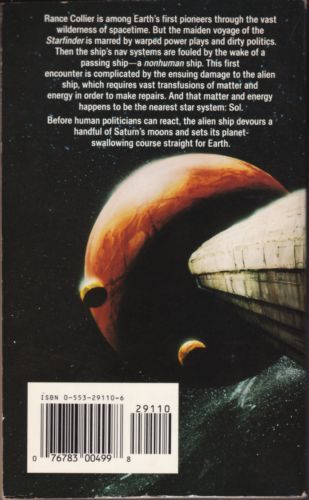 "Rance Collier is among Earth's first pioneers through the vast wilderness of spacetime. But the maiden voyage of the Starfinder is marred by warped power plays and dirty politics. Then the ship's nav systems are fouled by the wake of a passing ship--a nonhuman ship. This first encounter is complicated by the ensuing damage to the alien ship, which requires vast transfusions of matter and energy in order to make repairs. And that matter and energy happens to be the nearest star system: Sol. Before human politaicians can react, the alien ship devours a handful of Saturn's moons and sets its planet-swallowing course straight for Earth."--Back cover.