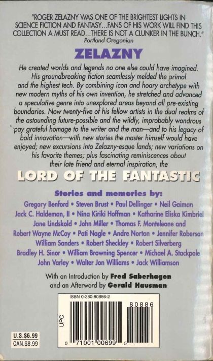 Roger ZelanyHe created worlds and legends no one else could have imagined.His groundbreaking fiction seamlessly melded the primaland the highest tech. By combining icon and hoary archetype withnew modem myths of his own invention, he stretched and advanceda speculative genre into unexplored areas beyond all pre-existingboundaries. Now twenty-five of his fellow artists in the dual realms ofthe astounding future-possible and the wildly, improbably wondrous'Pay grateful homage to the writer and the man-and to his legacy ofbold innovation-with new stories the master himself would haveenjoyed; new excursions into Zelazny-esque lands; new variations onhis favorite themes; plus fascinating reminiscences abouttheir late friend and eternal inspiration, the Lord of the Fantastic.He created worlds and legends no one else could have imagined. His groundbreaking fiction seamlessly melded the primal and the highest tech. By combining icon and hoary archetype with new modern myths of his own invention, he stretched and advanced a speculative genre into unexplored areas beyond all pre-existing boundaries. Now twenty-five of his fellow artists in the dual realms of the astounding future-possible and the wildly, improbably wondrous pay grateful homage to the writer and the man-and to his legacy of bold innovation-with new stories the master himself would have enjoyed; new excursions into Zelazny-esque lands; new variations on his favorite themes; plus fascinating reminiscences about their late friend and eternal inspiration, the LORD OF THE FANTASTIC.