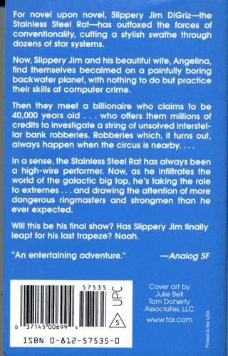 Slippery Jim DiGriz. The galaxy's greatest thief and con artist: the Stainless Steel Rat. For novel upon novel, Jim DiGriz has outfoxed the forces of conventionality, cutting a stylish swathe through dozens of star systems. Now, Slippery Jim and his beautiful wife Angelina find themselves becalmed on a painfully boring backwater planet, with nothing to do but practice their skills at computer crime.Then they meet a billionaire who claims to be 40,000 years old--who offers them millions of credits to investigate a string of unsolved interstellar bank robberies. Robberies which, it turns out, always happen when the circus is nearby. . . .In a sense, The Stainless Steel Rat has always been a high-wire performer. Now, as he infiltrates the world of the galactic big top, he's taking the role to extremes . . . and drawing the attention of more dangerous ringmasters and strongmen than he ever expected. Will this be his final show? Has Slippery Jim finally leapt for his last trapeze? Naaah.