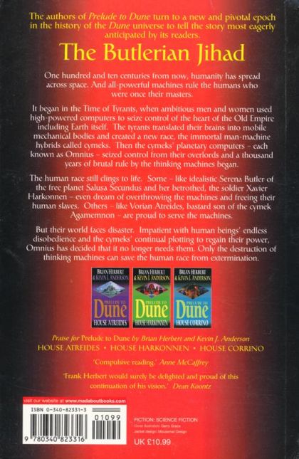 One hundred and ten centuries from now, humanity has spread across space. And all-powerful machines rule the humans who were once their masters. It began in the Time of Tyrants, when ambitious men and women used high-powered computers to seize control of the heart of the Old Empire including Earth itself. The tyrants translated their brains into mobile mechanical bodies and created a new race, the immortal man-machine hybrids called cymeks. Then the cymeks planetary computers - each known as Omnius - seized control from their overlords and a thousand years of brutal rule by the thinking machines began. The human race still clings to life. Some - like idealistic Serena Butler of the free planet Salusa Secundus and her betrothed, the soldier Xavier Harkonnen - even dream of overthrowing the machines and freeing their human slaves. Others - like Vorian Atreides, bastard son of the cymek Agamemnon - are proud to serve the machines. But their world faces disaster. Impatient with human beings endless disobedience and the cymeks continual plotting to regain their power, Omnius has decided that it no longer needs them. Only the destruction of thinking machines can save the human race from extermination.