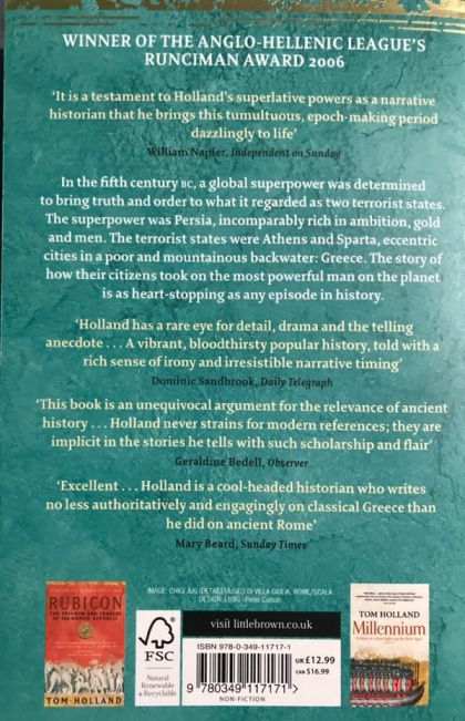 In 480 BC, Xerxes, the King of Persia, led an invasion of mainland Greece. Its success should have been a formality. For seventy years, victory - rapid, spectacular victory - had seemed the birthright of the Persian Empire. In the space of a single generation, they had swept across the Near East, shattering ancient kingdoms, storming famous cities, putting together an empire which stretched from India to the shores of the Aegean. As a result of those conquests, Xerxes ruled as the most powerful man on the planet. Yet somehow, astonishingly, against the largest expeditionary force ever assembled, the Greeks of the mainland managed to hold out. The Persians were turned back. Greece remained free. Had the Greeks been defeated at Salamis, not only would the West have lost its first struggle for independence and survival, but it is unlikely that there would ever have been such and entity as the West at all. Tom Holland's brilliant new book describes the very first 'clash of Empires' between East and West. Once again he has found extraordinary parallels between the ancient world and our own. There is no competing popular book describing these events.