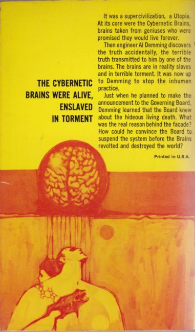 It was a supercivilization. a Utopia. At its core were the Cybernetic Brains,brains taken from geniuses who were promised they would live forever. Then engineer Al Demming discovers the truth accidentally. the terrible truth transmitted to him by one of the brains. The brains are in reality slaves and in terrible torment. It was now up to Demming to stop the inhuman practice Just when he planned to make the announcernent to the Board, Demming learned that the Board knew about the hideous living death. What was the real reason bhind the facade? How could he cnvince the Bourd to suspend the system before the Brains revolted and destroyed the world?