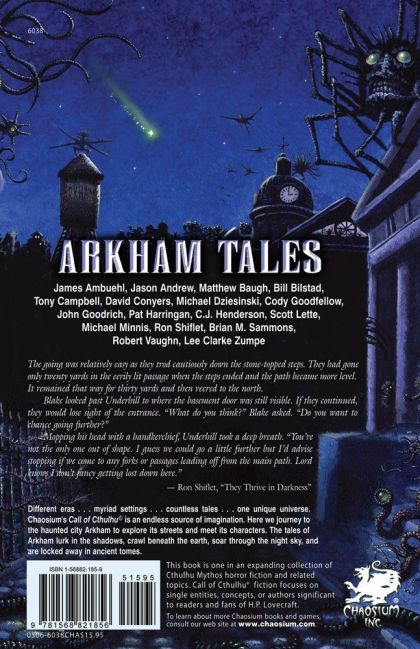 Nestled along the Massachusetts coast, the small town of Arkham has existed for centuries. It is the source of countless rumors and legends. Tales of Arkham are whispered by those who have visited it, each telling a different and remarkable account. Reports of impossible occurrences, peculiar happenings and bizarre events, tales that test the sanity of the reader are to be found here. Magic, mysteries, monsters, mayhem, and ancient malignancies form the foundation of this unforgettable Eastern town. Collected in this volume are the strange and terrifying stories of the legend-haunted city.