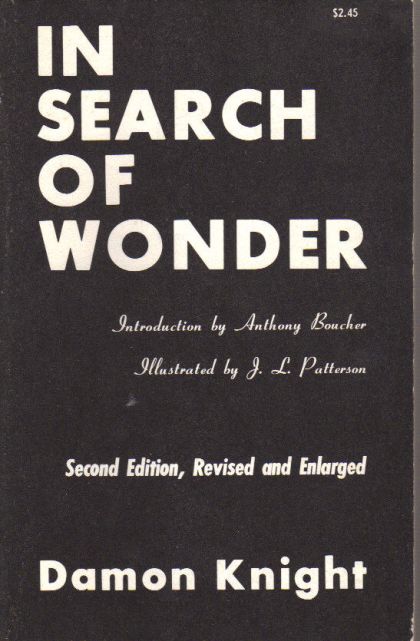 Very Good; see scans and description. Chicago: Advent Publishers, 1967. 'In Search of Wonder', by Damon Knight, in the 1967 Advent Second Edition, Revised and Enlarged. Berkley edition. Octavo, printed perfect-bound wraps, 318 pp.(xii + 306). Several full-page b&w cartoons by J.L. Patterson. Very Good; small abrasions at front cover (scan), corners touched, toning to the white background of the rear cover. See scans. Outstanding sci-fi analysis and scholarly critique by Knight, including treatments of Robert Heinlein, Ray Bradbury, A.E. Van Vogt, Theodore Sturgeon, and others. Ships in a new, sturdy, protective box, not a bag. L71