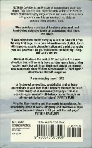 Four hundred years from now mankind is strung out across a region of interstellar space inherited from an ancient civilization discovered on Mars. The colonies are linked together by the occasional sublight colony ship voyages and hyperspatial data-casting. Human consciousness is digitally freighted between the stars and downloaded into bodies as a matter of course. But some things never change. So when ex-envoy, now-convict Takeshi Kovacs has his consciousness and skills downloaded into the body of a nicotine-addicted ex-thug and presented with a catch-22 offer, he really shouldn¿t be surprised. Contracted by a billionaire to discover who murdered his last body, Kovacs is drawn into a terrifying conspiracy that stretches across known space and to the very top of society. For a first-time SF writer to be so surely in command of narrative and technology, so brilliant at world-building, so able to write such readable and enjoyable SF adventure, is simply extraordinary.