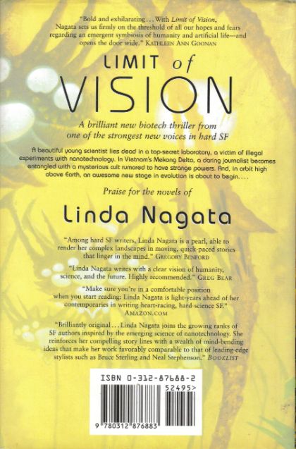 With her imaginative far-future epics -- which includes The Bohr Maker, winner of the Locus Award for Best First Novel -- Linda Nagata burst on the scene as one of the most visionary writers of hard SF working today. The Denver Post called her a rising star to watch.Now Nagata makes her hardcover debut with Limit of Vision, a gripping and engrossing saga of a frighteningly plausible future in which new breakthroughs in biotechnology are spinning out of control.A beautiful young scientist lies dead in a top-secret laboratory, a victim of an illegal experiment with the forbidden nanotechnology known as LoVs -- intelligent organisms that live at the limits of human vision. In Vietnam's Mekong Delta, a daring journalist probes a mysterious cult rumored to have awesome powers. As factions across the globe race to control this strange creation, in orbit high above Earth, an awesome new stage in evolution is about to begin. . . .