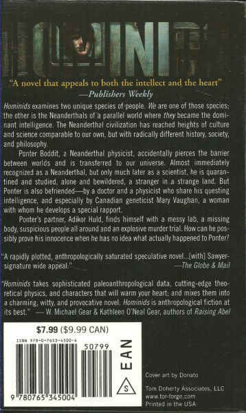 02 Hominids examines two unique species of people. We are one of those species; the other is the Neanderthals of a parallel world where they became the dominant intelligence. The Neanderthal civilization has reached heights of culture and science comparable to our own, but with radically different history, society and philosophy. Ponter Boddit, a Neanderthal physicist, accidentally pierces the barrier between worlds and is transferred to our universe. Almost immediately recognized as a Neanderthal, but only much later as a scientist, he is quarantined and studied, alone and bewildered, a stranger in a strange land. But Ponter is also befriended—by a doctor and a physicist who share his questing intelligence, and especially by Canadian geneticist Mary Vaughan, a woman with whom he develops a special rapport. Ponter’s partner, Adikor Huld, finds himself with a messy lab, a missing body, suspicious people all around and an explosive murder trial. How can he possibly prove his innocence when he has no idea what actually happened to Ponter? Hominids examines two unique species of people. We are one of those species; the other is the Neanderthals of a parallel world where they became the dominant intelligence. The Neanderthal civilization has reached heights of culture and science comparable to our own, but with radically different history, society and philosophy. Ponter Boddit, a Neanderthal physicist, accidentally pierces the barrier between worlds and is transferred to our universe. Almost immediately recognized as a Neanderthal, but only much later as a scientist, he is quarantined and studied, alone and bewildered, a stranger in a strange land. But Ponter is also befriended—by a doctor and a physicist who share his questing intelligence, and especially by Canadian geneticist Mary Vaughan, a woman with whom he develops a special rapport. Ponter’s partner, Adikor Huld, finds himself with a messy lab, a missing body, suspicious people all around and an explosive murder trial. How can he possibly prove his innocence when he has no idea what actually happened to Ponter?