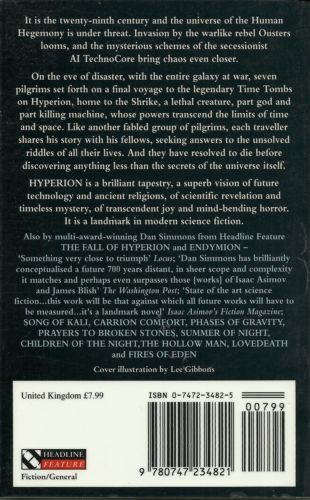 On the world called Hyperion, beyond the law of the Hegemony of Man, there waits the creature called the Shrike. There are those who worship it. There are those who fear it. And there are those who have vowed to destroy it. In the Valley of the Time Tombs, where huge, brooding structures move backward through time, the Shrike waits for them all. On the eve of Armageddon, with the entire galaxy at war, seven pilgrims set forth on a final voyage to Hyperion seeking the answers to the unsolved riddles of their lives. Each carries a desperate hope--and a terrible secret. And one may hold the fate of humanity in his hands. "From the Paperback edition."