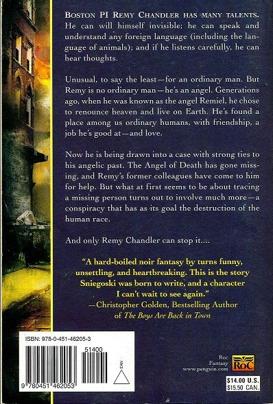 Generations ago, angel Remiel chose to renounce heaven and live on Earth. He found a place among ordinary humans by converting himself into Boston P.I. Remy Chandler, but he can never tell anyone who he was or that he still has angelic powers. Remy can will himself invisible, speak and understand any foreign language (including any animal language), and hear the thoughts of others. All these secret powers come in handy for a private investigator, especially when the Angel of Death goes missing and he’s assigned to find him. As he gets deeper into the investigation, he realizes this is not a missing persons case but a conspiracy to destroy the human race and only Remy has the powers to stop the forces of evil.