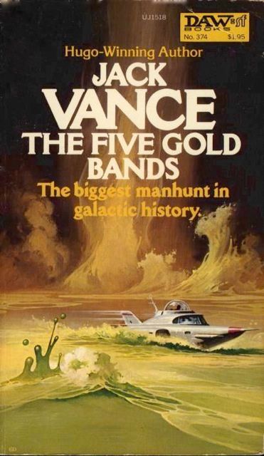 "Earth lacked the secret of the interstellar space drive. So when it turned out that the galaxy was chock full of wealthy planets and haughty aliens who had the star drive, it made our native world a backward place indeed. Paddy Blackthorn was an adventurous sort who wasn't going to stand for this. So he set off to steal the secret of interstellar flight from the powerful Shauls--who nabbed him and dumped him on a barren planet for punishment. Yet it was there that Paddy acquired five golden bands that contained in code the very data the Shauls had sought to conceal. Paddy had to keep on the run with the bands until they could be deciphered ... and thereby touched off the greatest manhunt in galactic history!"--Page 4 of cover.