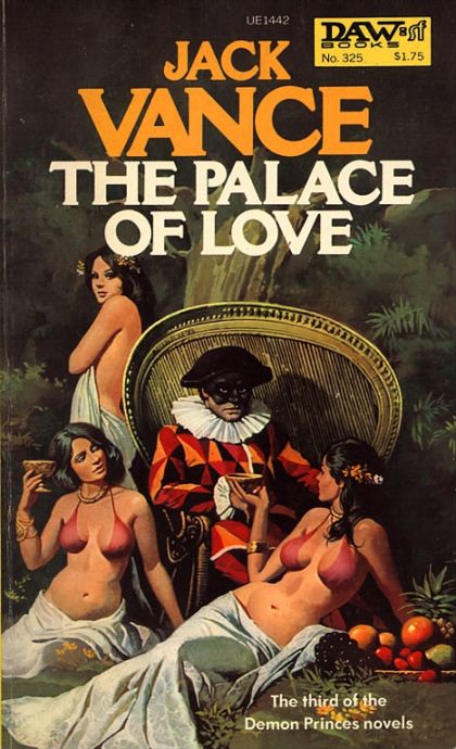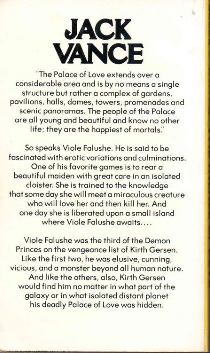"'The Palace of Love extends over a considerable area and is by no means a single structure but rather a complex of gardens, pavilions, halls, domes, towers, promenades and scenic panoramas. The people of the Palace are all young and beautiful and know no other life; they are the happiest of mortals.' So speaks Viole Falushe. He is said to be fascinated with erotic variations and culminations. One of his favorite games is to rear a beautiful maiden with great care in an isolated cloister. She is trained to the knowledge that some day she will meet a miraculous creature who will love her and then kill her. And one day she is liberated upon a small island where Viole Falushe awaits... Viole Falushe was the third of the Demon Princes on the vengeance list of Kirth Gersen. Like the first two, he was elusive, cunning, vicious, and a monster beyond all human nature. And like the others, also, Kirth Gersen would find him no matter in what part of the galaxy or in what isolated distant planet his deadly Palace of Love was hidden."--Pg. [4] of cover.
