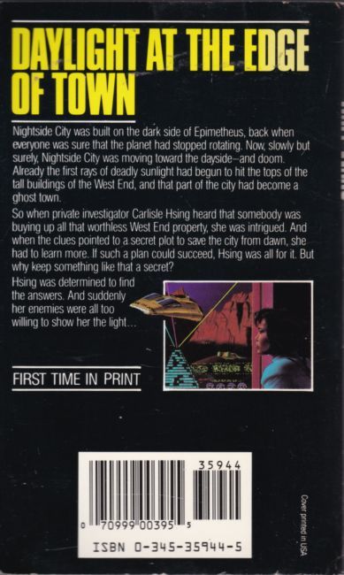 Daylight at the Edge of Town: Nightside City was built on the dark side of Epimetheus, back when everyone was sure that the planet had stopped rotating. Now, slowly but surely, Nightside City was moving toward the dayside -- and doom. Already the first rays of deadly sunlight had begun to hit the tops of the tall buildings in the West End, and that part of the city had become a ghost town. So when private investigator Carlisle Hsing heard that somebody was buying up all that worthless West End property, she was intrigued. And when the clues pointed to a secret plot to save the city from dawn, she had to learn more. If such a plan could succeed, Hsing was all for it. But why keep something like that a secret? Hsing was determined to find the answers. And suddenly her enemies were all too willing to show her the light...