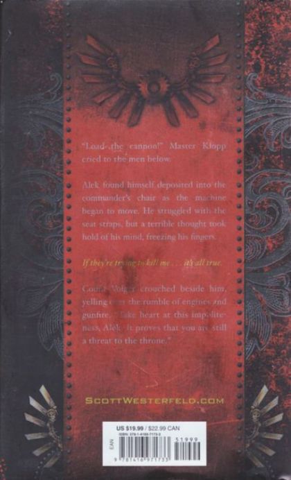 It is the cusp of World War I, and all the European powers are arming up. The Austro-Hungarians and Germans have their Clankers, steam-driven iron machines loaded with guns and ammunition. The British Darwinists employ fabricated animals as their weaponry. Their Leviathan is a whale airship, and the most masterful beast in the British fleet. Aleksandar Ferdinand, prince of the Austro-Hungarian Empire, is on the run. His own people have turned on him. His title is worthless. All he has is a battle-torn Stormwalker and a loyal crew of men. Deryn Sharp is a commoner, a girl disguised as a boy in the British Air Service. She's a brilliant airman. But her secret is in constant danger of being discovered. With the Great War brewing, Alek's and Deryn's paths cross in the most unexpected way...taking them both aboard the Leviathan on a fantastical, around-the-world adventure. One that will change both their lives forever.