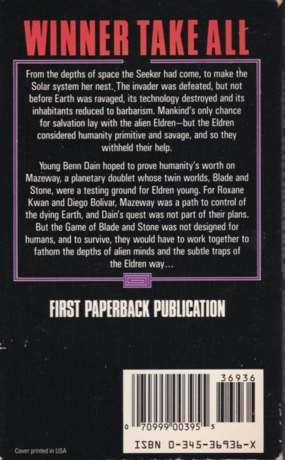 Winner Take All: From the depths of space the Seeker had come, to make the Solar system her nest. The invader was defeated, but not before Earth was ravaged, its technology destroyed and its inhabitants reduced to barbarianism. Mankind's only chance for salvation lay with the alien Eldren -- but the Eldren considered humanity primitive and savage, and so they withheld their help. Young Benn Dain hoped to prove humanity's owrth on Mazeway, a planetary doublet whose twin worlds, Blade and Stone, were a testing ground for Eldren young. For Roxane Kwan and Diego Bolivar, Mazeway was a path to control of the dying Earth, and Dain's quest was not part of their plans. But the Game of Blade and Stone was not designed for humans, and to survive, they would have to work together to fathom the depths of alien minds and the subtle traps of the Eldren way...