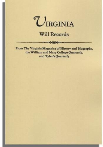 Virginia Will Records is composed of articles dealing with Virginia wills, inventories, and administration accounts and contains virtually everything pertaining to estate records ever published in the leading Virginia periodicals. Also incorporated in the collection are a number of articles containing abstracts of various companion records--court minutes and deeds, for example--as well as a smaller group of articles dealing with the probate of certain wills in England. Their appearance here--along with an index of 27,000 entries--will spare the genealogist the trouble of searching through hundreds of out-of-the-way volumes and save an untold amount of time in research. The following are the Virginia counties pertaining to which one or more articles may be found in the collection: Accomac, Albemarle, Amherst, Botetourt, Brunswick, Caroline, Charles City, Dinwiddie, Elizabeth City, Fluvanna, Frederick, Fredericksburg, Goochland, Hampshire (WV), Hanover, Hardy (WV), Isle of Wight, King William, Lancaster, Louisa, Middlesex, Northampton, Petersburg, Pittsylvania, Prince George, Princess Anne, Old Rappahannock, Richmond, Russell, Stafford, Surry, Sussex, Westmoreland, and York.