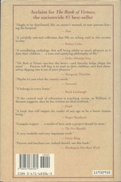 Responsibility. Courage. Compassion. Honesty. Friendship. Persistence. Faith. Everyone recognizes these traits as essentials of good character. In order for our children to develop such traits, we have to offer them examples of good and bad, right and wrong. And the best places to find them are in great works of literature and exemplary stories from history. William J. Bennett has collected hundreds of stories in The Book of Virtues, an instructive and inspiring anthology that will help children understand and develop character -- and help adults teach them. From the Bible to American history, from Greek mythology to English poetry, from fairy tales to modern fiction, these stories are a rich mine of moral literacy, a reliable moral reference point that will help anchor our children and ourselves in our culture, our history, and our traditions -- the sources of the ideals by which we wish to live our lives. Complete with instructive introductions and notes, The Book of Virtues is a book the whole family can read and enjoy -- and learn from -- together.