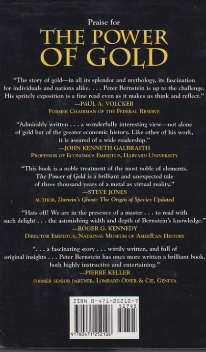 In this exciting new book, Peter L. Bernstein, who chronicled the evolution of risk in his recent bestseller, Against the Gods, tells the story of history's most coveted, celebrated, and inglorious asset: gold. From the ancient fascinations of Moses and Midas through the modern convulsions caused by the gold standard and its aftermath, gold has led many of its most eager and proud possessors to a bad end. Gold had them, rather than the other way around. And while the same cycle of obsession and desperation may reverberate in today's fast-moving, electronically-driven stock markets, the role of gold in shaping human history is the striking feature of this tumultuous tale. Such is the power of gold. This fascinating account begins with the magical, religious, and artistic qualities of gold and progresses to the invention of coinage, the transformation of gold into money, and the gold standard. The more important gold becomes as money, the more loudly it speaks of power--even more loudly than when it served as an entry to Heaven or a symbol of omnipotence. Ultimately, the book confronts the future of gold in a world where it appears to have been relegated to the periphery of global finance. From the Bible to the Gold Rush era to modern day Fort Knox and beyond, unforgettable characters stride through these pages. Contemplate gold from the diverse perspectives of monarchs and moneyers, potentates and politicians, men of legendary wealth and others of more plebeian beginnings; from Asia Minor's King Croesus to Rome's noted speculator Crassus, to Byzantine emperors and humble miners, Venice's Marco Polo and Spain's Francisco Pizarro, to Charlemagne and Charles de Gaulle, Richard I and Richard Nixon, Isaac Newton and Winston Churchill, Britain's economists David Ricardo and John Maynard Keynes, and Christopher Columbus and the Forty-Niners. Perhaps most remarkable are the frantic speculators who pushed gold to $850.00 an ounce in 1980 just as their counterparts twenty years later drove Internet stocks to exorbitant heights. Whether it is Egyptian pharaohs with depraved tastes, the luxury-mad survivors of the Black Death, the Chinese inventor of paper money, the pirates on the Spanish Main, or the hardnosed believers in the international gold standard like the United States' President Herbert Hoover, gold has been the supreme possession. It has been an icon for greed and an emblem of rectitude, as well as a vehicle for vanity and a badge of power that has shaped the destiny of humanity through the ages. As Bernstein muses, "The joke is that nothing is as useless and useful all at the same time." Far more than a tale of romantic myths, daring explorations, and the history of money and power struggles, The Power of Gold suggests that the true significance of this infamous element may lie in the timeless passions it continues to evoke, and what this reveals about ourselves.