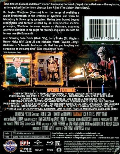 Dr. Peyton Westlake is on the verge of realizing a major breakthrough in synthetic skin when his laboratory is destroyed by gangsters. Having been burned beyond recognition and forever altered by an experimental medical procedure, Westlake becomes known as Darkman, assuming alternate identities in his quest for revenge and a new life with a former love.