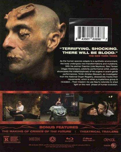 Humans adapt to a synthetic environment, with new transformations and mutations. With his partner Caprice, Saul Tenser, celebrity performance artist, publicly showcases the metamorphosis of his organs in avant-garde performances.