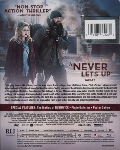 BUSHWICK tells the story of twenty-year- old Lucy (Snow) and war veteran Stupe (Bautista). Texas is trying to secede from the U.S., and NYC is being used as a negotiation tool. Lucy meets Stupe after coming up from the subway into the military invasion of Brooklyn. Together they decide to cross the treacherous five blocks of Bushwick - littered with looters, local militias, the invading forces, and one crazy cousin - in order to get home and be reunited with Lucy's grandmother.