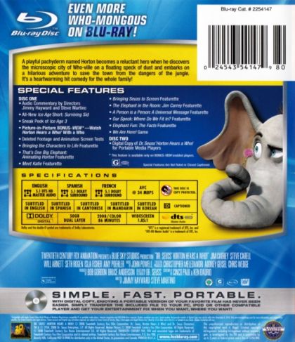 The classic and beloved story from Dr. Seuss is now a CG animated film from 20th Century Fox Animation, the makers of the Ice Age films. An imaginative elephant named Horton (Jim Carrey) hears a faint cry for help coming from a tiny speck of dust floating through the air. Horton suspects there may be life on that speck and despite a surrounding community, which thinks he has lost his mind, he is determined to save the tiny particle! Jim Carrey and Steve Carell lead an all-star cast in bringing this wonderful family picture to life!