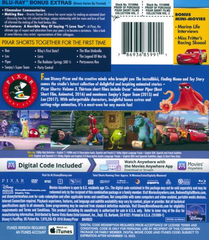 From Disney-Pixar and the creative minds who brought you The Incredibles, Finding Nemo and Toy Story comes the studio’s latest collection of delightful and inspiring animated stories – Pixar Shorts: Volume 3. Eleven short films include Oscar® winner Piper (Best Short Film, Animated, 2016) and nominees Sanjay’s Super Team (2015) and Lou (2017). With unforgettable characters, insightful bonus extras, and cutting-edge animation, it’s a must-own for any movie fan!