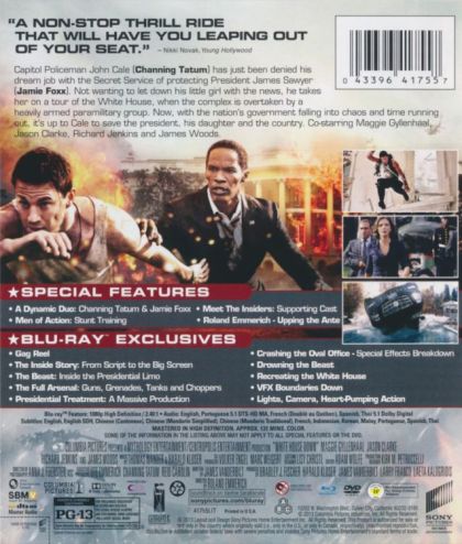 Capitol Policeman John Cale has just been denied his dream job with the Secret Service protecting President James Sawyer. Not wanting to let down his little girl with the news, he takes her on a tour of the White House, when the complex is overtaken by a heavily armed paramilitary group. Now, with the nation's government falling into chaos and time running out, it's up to Cale to save the president, his daughter, and the country.