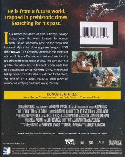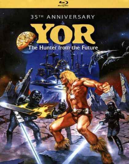 In prehistoric times, the muscular Yor saves his cave-babe from a dinosaur just before they get zapped into the future to battle bad guys in the familiar desolate wasteland.