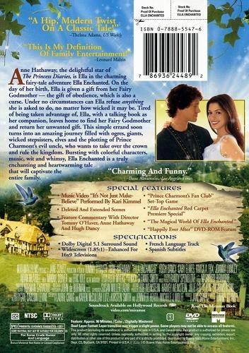 Ella lives in a magical world in which each child, at the moment of their birth, is given a virtuous "gift" from a fairy godmother. Ella's so-called gift, however, is obedience. This birthright proves itself to be quite the curse once Ella finds herself in the hands of several unscrupulous characters whom she quite literally cannot disobey. Determined to gain control of her life and decisions, Ella sets off on a journey to find her fairy godmother who she hopes will lift the curse. The path, however, isn't easy -- Ella must outwit a slew of unpleasant obstacles including ogres, giants, wicked stepsisters, elves and Prince Charmont's evil uncle, who wants to take over the crown and rule the kingdom.