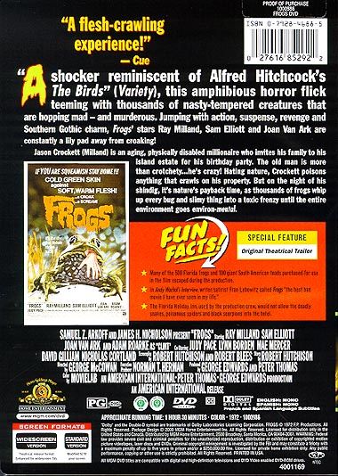 Jason Crockett is an aging, grumpy, physically disabled millionaire who invites his family to his island estate for his birthday celebration. Pickett Smith is a free-lance photographer who is doing a pollution layout for an ecology magazine. Jason Crockett hates nature, poisoning anything that crawls on his property. On the night of his birthday the frogs and other members of nature begin to pay Crockett back.
