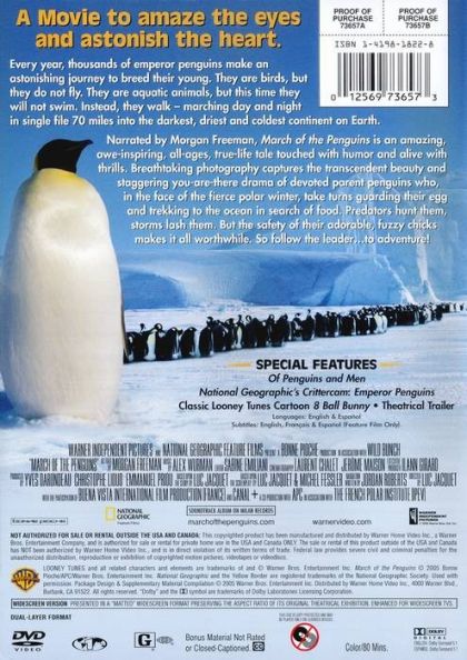 Every year, thousands of Antarctica's emperor penguins make an astonishing journey to breed their young. They walk, marching day and night in single file 70 miles into the darkest, driest and coldest continent on Earth. This amazing, true-life tale is touched with humour and alive with thrills. Breathtaking photography captures the transcendent beauty and staggering drama of devoted parent penguins who, in the fierce polar winter, take turns guarding their egg and trekking to the ocean in search of food. Predators hunt them, storms lash them. But the safety of their adorable chicks makes it all worthwhile. So follow the leader... to adventure!!