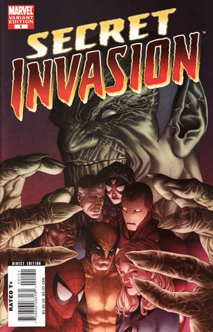 The Skrull agenda that has been hinted at for months is put into top gear. A lone Skrull craft lands in the Savage Land, and both teams of Avengers head in to investigate, despite their lack of trust for each other. The find the installation they were captured in back from New Avengers #5, in much worse repair than it used to be. They also find the Skrull craft, but before they can tear it open, a wave of attacks from Skrull agents strike down most human resistance, often accompanied by the mantra "He Loves You." Iron Man is felled by a virus, the orbiting S.W.O.R.D. installation is destroyed, the Baxter Building is sucked into the Negative Zone, Reed Richards is seriously wounded, and a spacecraft full of what appear to be heroes in old school costumes cracks open.