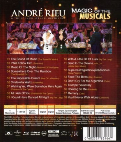 The Dutch violinist and the Johann Strauss Orchestra perform a number of musical hits. André Rieu is one of the bestselling modern classical artists, with over 20 million sales worldwide and a string of successful tours behind him. Rieu set up the Johann Strauss Orchestra in 1987 with the dual aim of promoting the waltz music he loves while introducing a wider audience to the pleasures of classical music. Here Rieu and his orchestra turn their attention to memorable songs from stage musicals, providing their own take on a number of popular tunes.